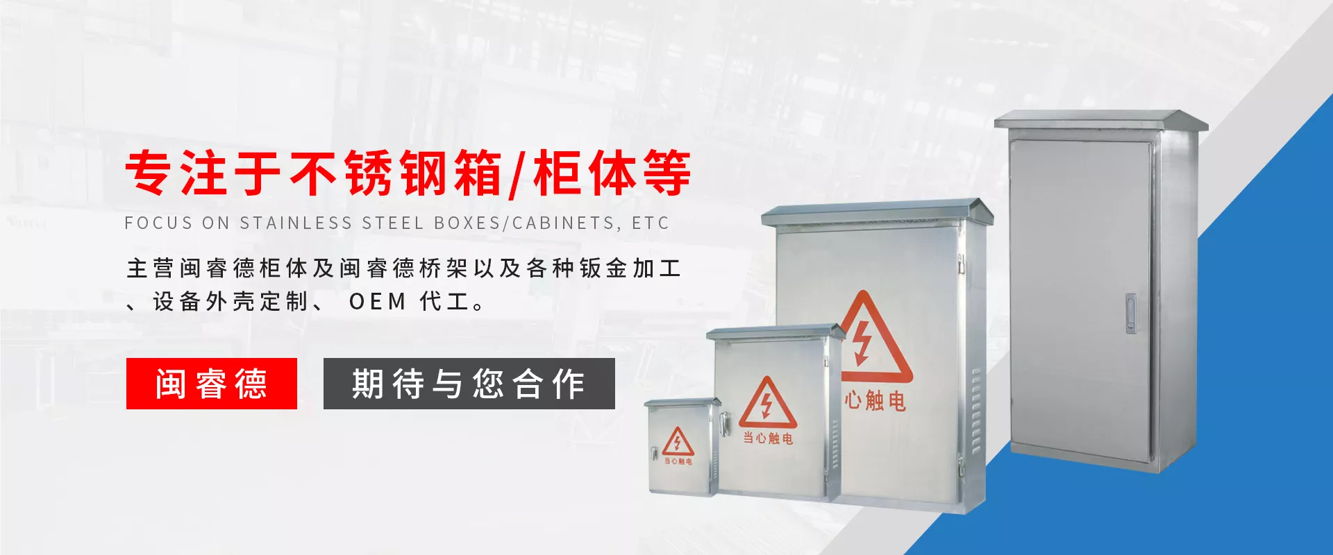 福州闽睿德机电设备有限公司座落于现代化的温泉之都福州。是一家集研发、生产、工程、销售为一体的高科技民营企业,主营闽睿德柜体及闽睿德桥架以及各种钣金加工、设备外壳定制、 OEM 代工。闽睿德柜体产品涉及各种高低压配电箱柜以及自动化过程控制箱柜(如工业设备变频控制系统,各类大功率点击群控软启动,电梯、锅炉变频控制系统,空调冷冻、冷却水泵、供水水泵变频群控系统等)、楼宇安防、消防系统控制箱柜、以及各类标准、非标工控机柜、网络机柜、户外箱,不锈钢箱柜制品,操作台等。